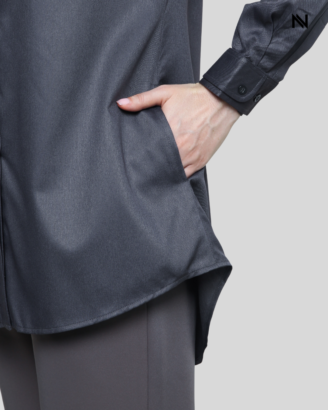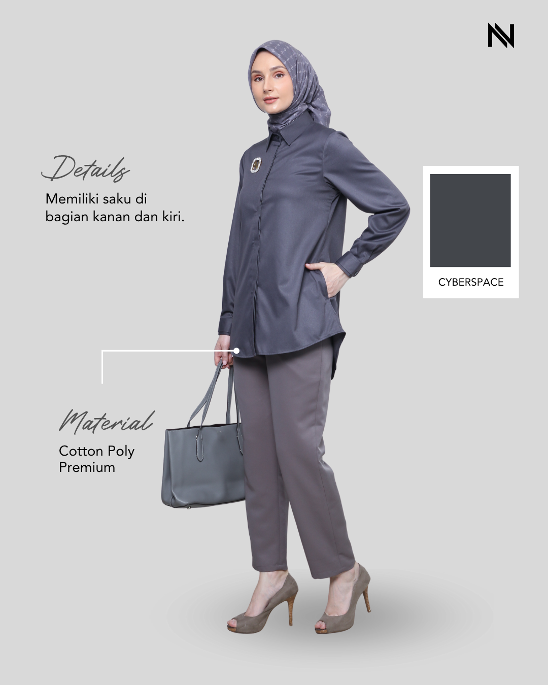 Detail desainnya menonjolkan kerah kemeja rapih dengan opening hidden button, lengan panjang dengan variasi double manset yang memudahkan berwudhu (wudhu friendly).